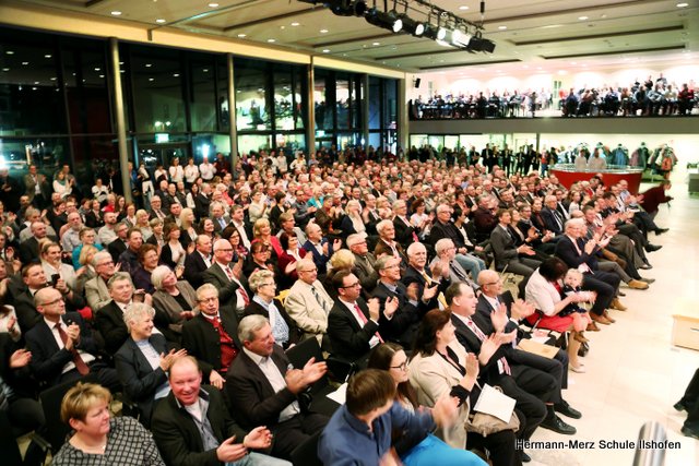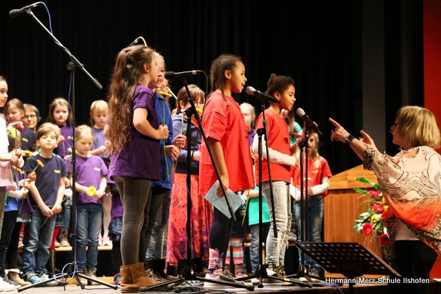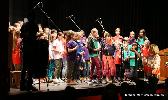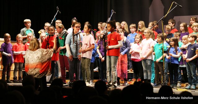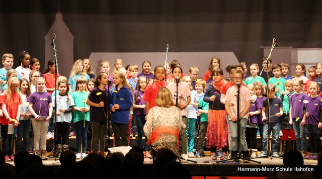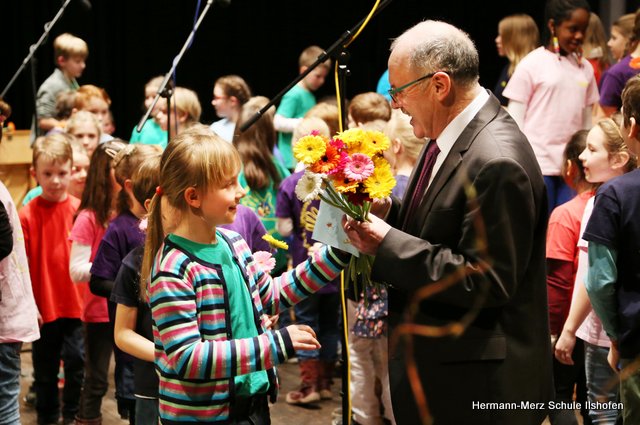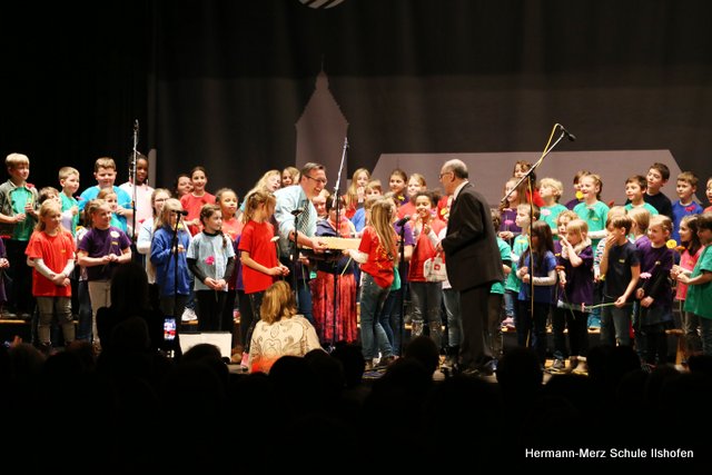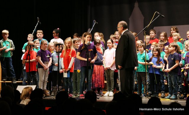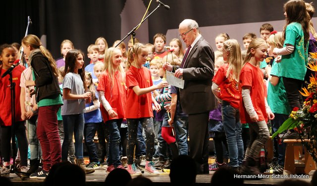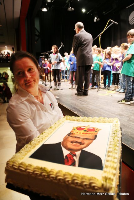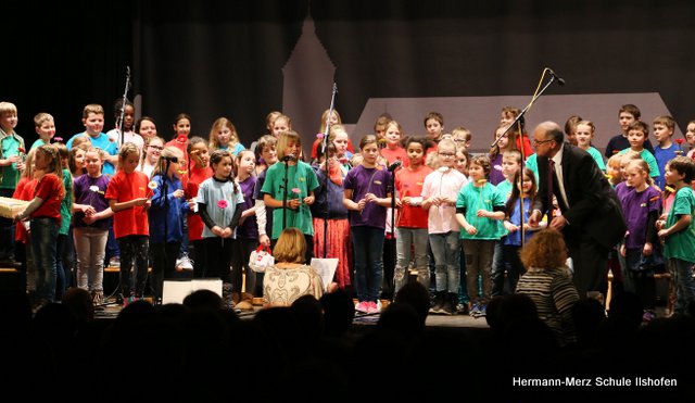 Am 16.03.2018 wurde der langjährige Ilshofener Bürgermeister Roland Wurmthaler in der Stadthalle, die seither seinen Namen trägt, nach 32 Jahren würdevoll aus seinem Amt verabschiedet. Für diesen Festakt hatte er sich ausdrücklich auch einen Beitrag des Grundschulchores gewünscht. Diesem Wunsch kamen die Kinder gerne nach. Mit drei Liedern, sehr persönlichen Worten sowie diversen Geschenken gelang es dem Grundschulchor, die ganze Halle und natürlich auch Herrn Wurmthaler restlos zu begeistern. Was Hildegard Fischer, die Leiterin und Seele des Grundschulchors, gemeinsam mit Thorsten Lemke am Klavier mit den Kindern einstudiert hatte, riss die vollbesetzte Halle zu echten Begeisterungsstürmen hin. Es war einfach großartig, mit welcher Begeisterung und welchem Talent unsere Grundschulkinder ihre Lieder und Texte zum Besten gaben. Bürgermeister Wurmthaler war spätestens, als er zum Abschied von jedem Chorkind eine Blume und eine riesige Torte mit seinem Konterfei überreicht bekam, den Tränen nah. Es war ein toller Auftritt, der noch lange in Erinnerung bleiben wird.